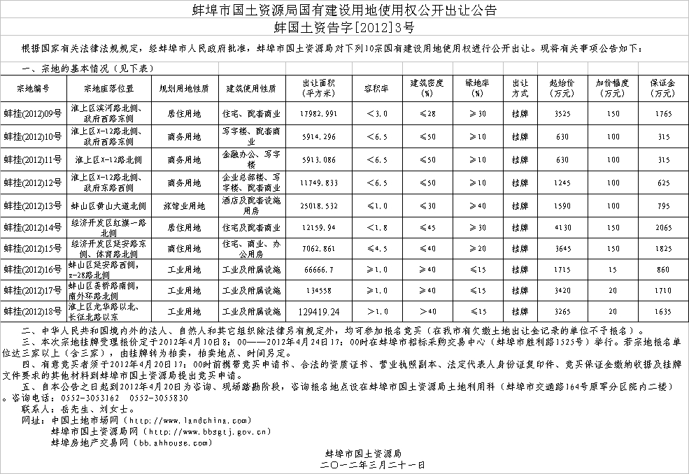 信息发布:第一地产网 信息来源:蚌埠市国土资源局 发布时间:2012-03-21