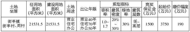 经诸暨市人民政府批准,诸暨市国土资源局决定公开拍卖出让诸暨市街亭镇街亭村、周村地块的商业、住宅、办公用地国有建设用地使用权。现将有关事项公告如下: