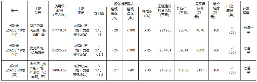 郑政出〔2025〕18号(网)地块为合村并城改造项目用地,郑政出〔2025〕19号(网)地块为城中村改造项目用地,郑政出〔2025〕20号(网)地块为政府储备地,拟建项目要严格按照城乡规划和相关规定执行,并节约集约利用土地。此次国有建设用地使用权网上挂牌出让的出让人为郑州市自然资源和规划局,具体实施由郑州市公共资源交易中心承办。