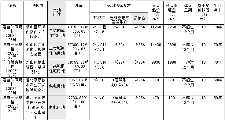 2.挂牌时间:2025年12月8日(周一)上午9时至2025年12月17日(周三)上午9时。在挂牌公示期截止前,符合条件的竞买人至少进行一次有效报价,初次报价不得低于起挂价。竞买人于2025年12月17日(周三)上午9时至淮北市公共资源交易中心出席现场挂牌会,有竞买人表示愿意继续竞价,转入现场竞价,通过现场竞价确定竞得人。挂牌出让最终截止时间以现场主持人宣布为准,在截止时间内可多次报价。