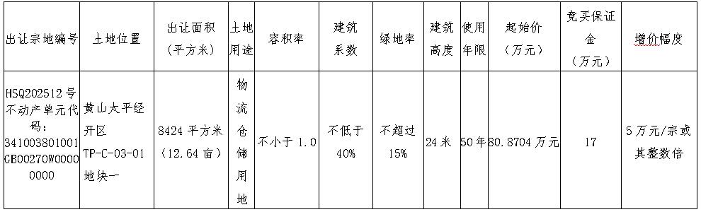 安徽省黄山市12月9日至12月19日挂牌出让黄山太平经 开区地块使用权