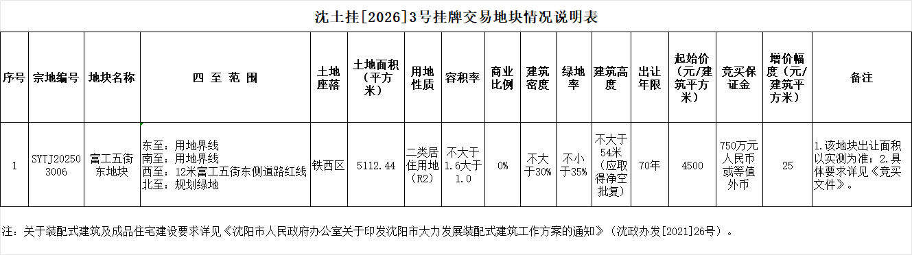经沈阳市人民政府批准,沈阳市自然资源局(沈阳市土地储备中心承办)组织挂牌交易SYTJ202503006号富工五街东地块,现将有关事项公告如下: