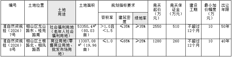 6、淮自然资规挂(2026)8号宗地规划用地性质为商业用地(零售商业用地、批发市场用地)。建筑高度不宜超过24米。若绿地率不满足淮北市绿化条例要求,土地竞得方应按要求异地补偿建设,由相山区人民政府协调。