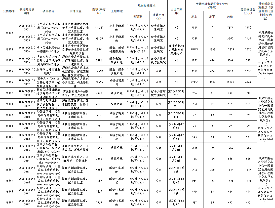 六、申请人可于2026年3月30日起登录济南公共资源交易中心—国有建设用地使用权、矿业权网上交易子系统(http://119.164.252.44:8001/portal/main.html,以下简称网上交易子系统)下载网上挂牌出让公告、网上挂牌出让须知及其他相关网上挂牌出让文件,并按上述文件规定的操作程序在网上参加竞买。
