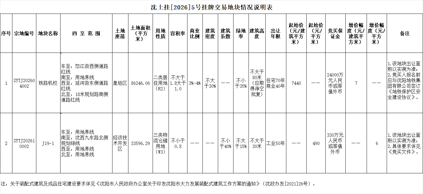 经沈阳市人民政府批准,沈阳市自然资源局(沈阳市土地储备中心承办)组织挂牌交易SYTJ202604002号铁路机校等2宗地块,现将有关事项公告如下: